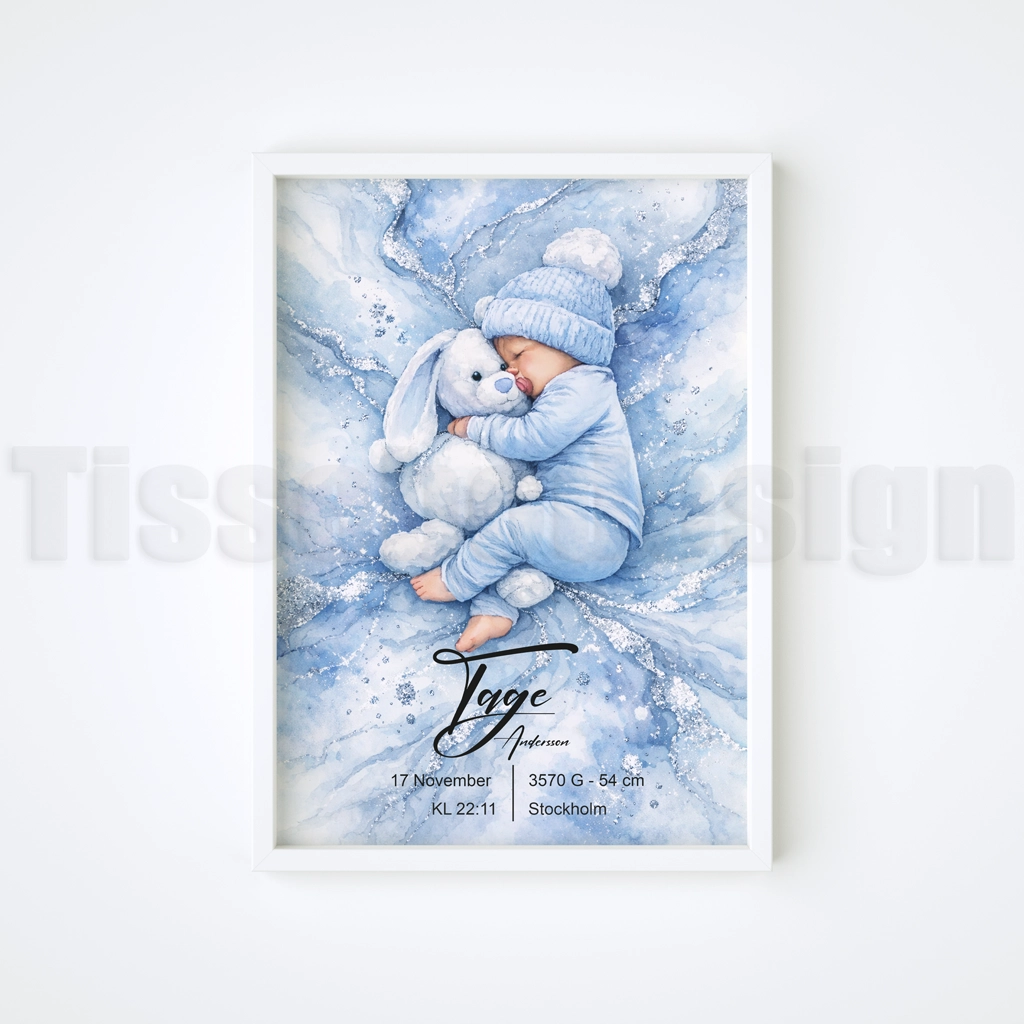 Att välkomna ett barn är ett ögonblick fyllt av kärlek, stolthet och magi. Denna doptavla med sovande baby och kanin skapar en personlig minnestavla där namn och födelsedetaljer får en självklar plats. En tidlös present som blir lika fin vid dopet som på väggen hemma – en doptavla med tryck som sparar minnet för alltid.