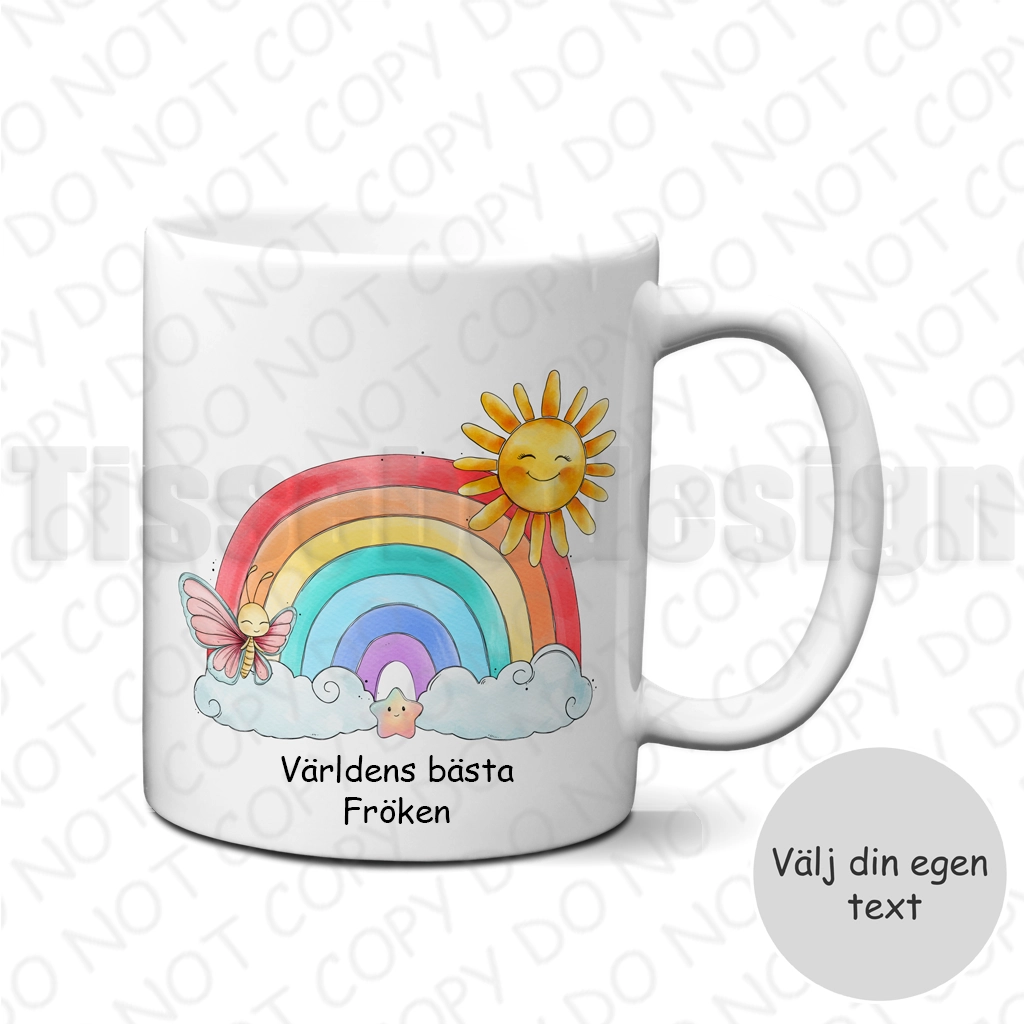 Den här muggen med ett charmigt motiv av regnbåge, sol och fjäril är en perfekt personlig present som sprider glädje i vardagen. Den mjuka färgpaletten och de söta detaljerna gör den lika uppskattad av barn som vuxna, oavsett tillfälle.