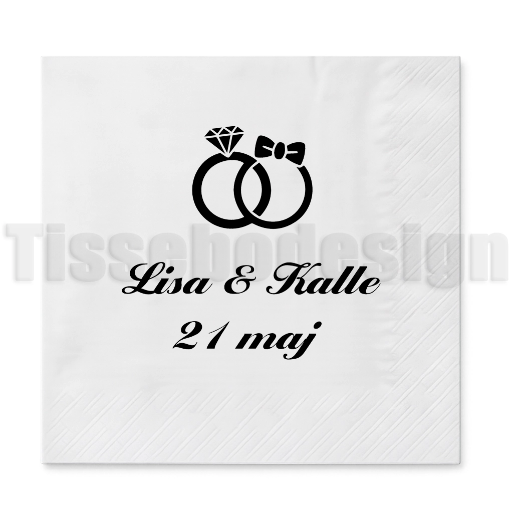 En servett med tryck fungerar både som dekoration och som ett fint minne från den stora dagen. Den stilrena designen med ringar och rosett passar lika bra till klassiska som moderna bröllop och hjälper dig skapa en genomtänkt och enhetlig dukning. Passar fint tillsammans med produkter som muggar eller kuddar & örngott för en komplett känsla.