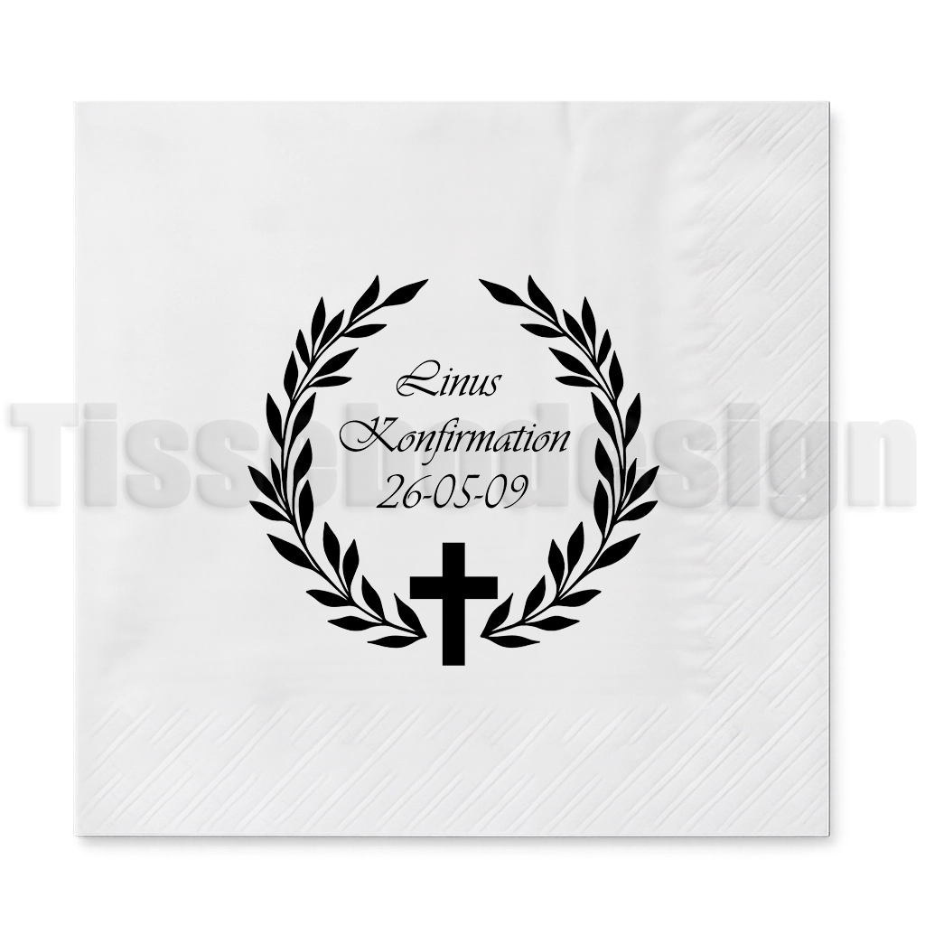 Den här servetten till konfirmation med lagerkrans och kors ger en stilren och genomtänkt dukning. Med möjlighet att lägga till namn och datum får du servetter med namn som skapar en personlig känsla och gör varje plats vid bordet unik. Perfekt för dig som vill lyfta dukningen med en enkel men betydelsefull detalj.