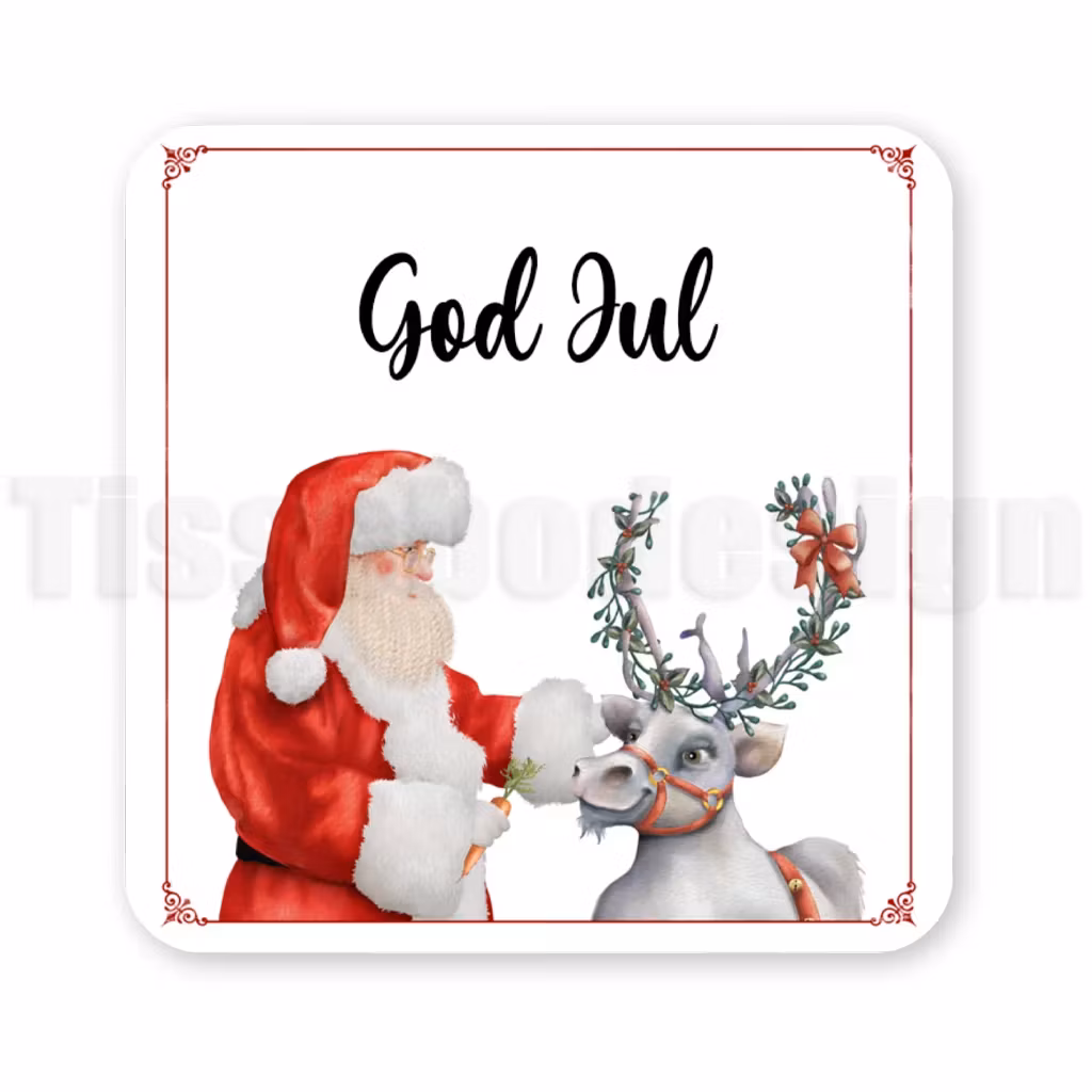 Den här julmagneten visar en vänlig tomte i röd dräkt som hälsar på en ren med dekorerade horn och texten God Jul ovanför. En varm och traditionell design som sprider julstämning i hemmet – perfekt för kylskåpet eller som liten present till någon som älskar klassiska julmotiv. Passar fint ihop med produkter ur kategorin jul, som personliga julkulor eller julsäckar med namn.