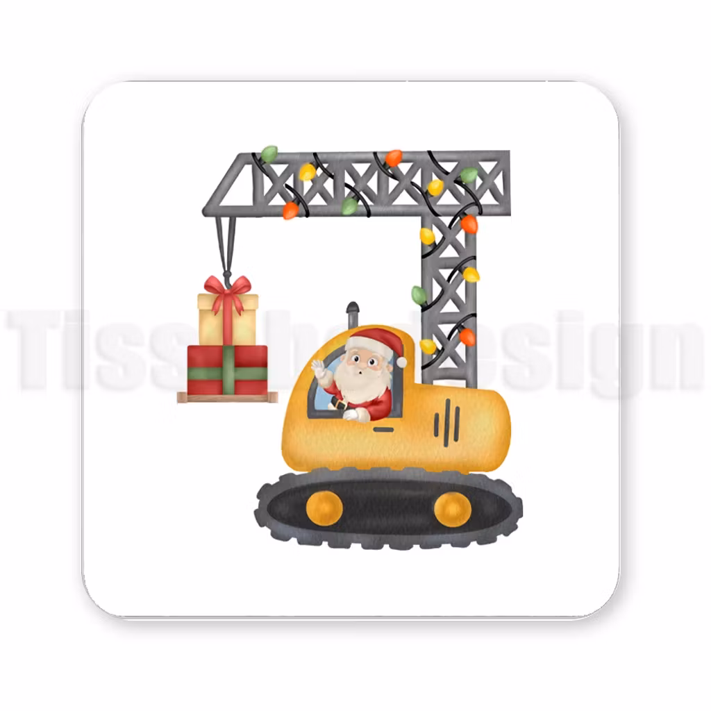 En magnet med tomte som kör en gul kran dekorerad med ljusslingor och ett stort paket i lyftkroken. Den här designen passar perfekt för maskinälskare, verkstäder och alla som vill addera lite humor till julen.