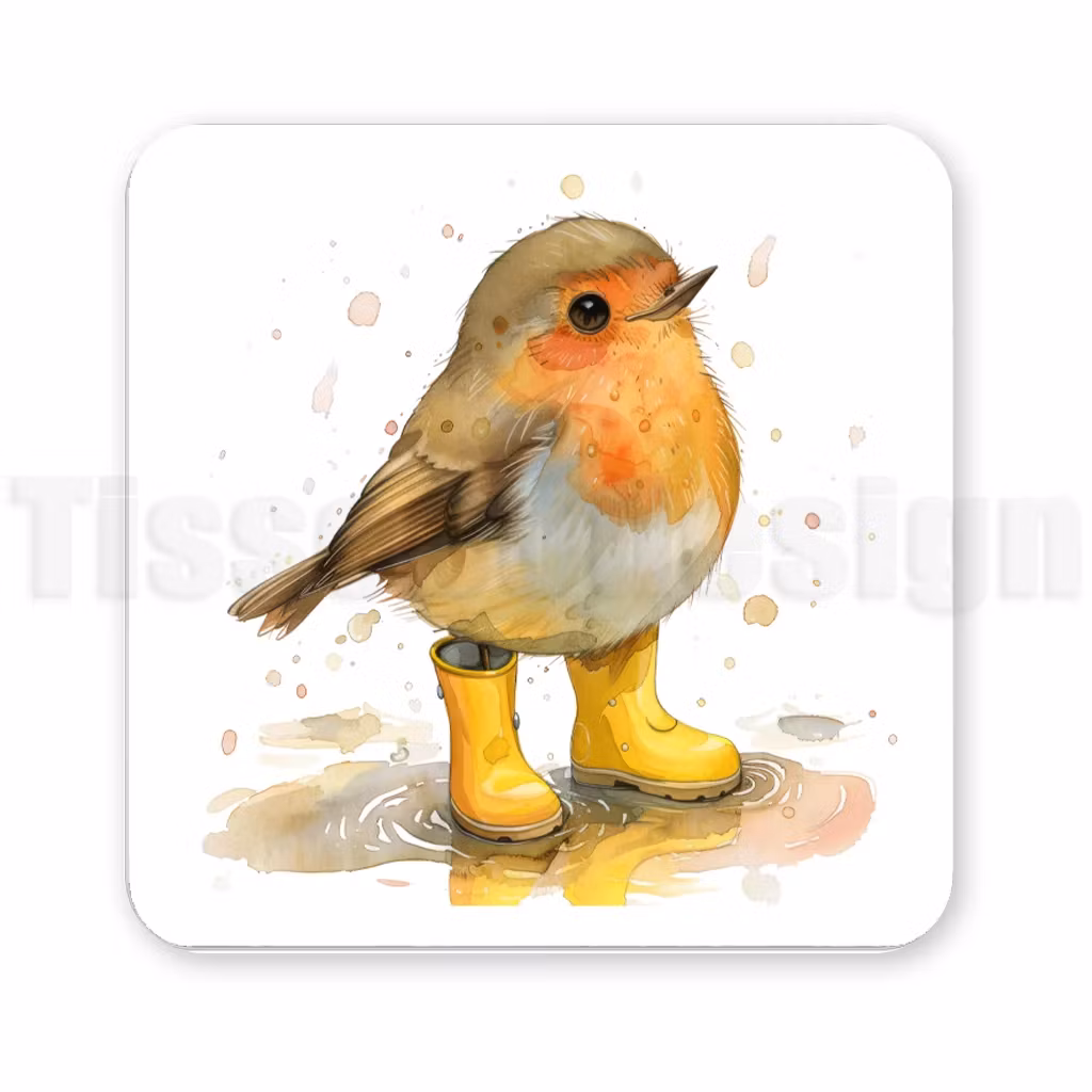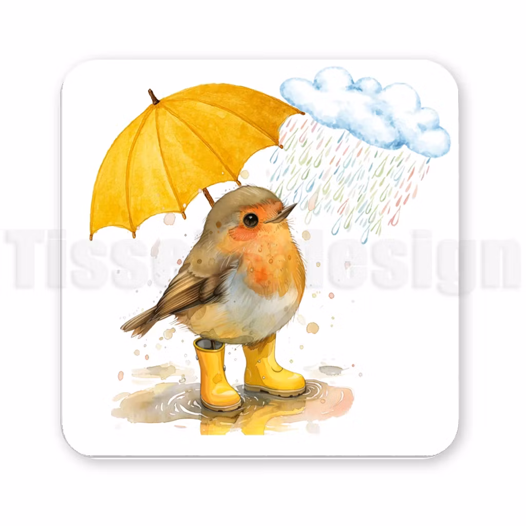 Den här magneten visar en gullig liten rödhake med gula gummistövlar – redo att hoppa i vattenpölar. Motivet finns i två varianter, en där fågeln står under ett gult paraply medan regnet faller från ett moln, och en utan paraply. Ett lekfullt och varmt motiv som passar både barn och vuxna året om.