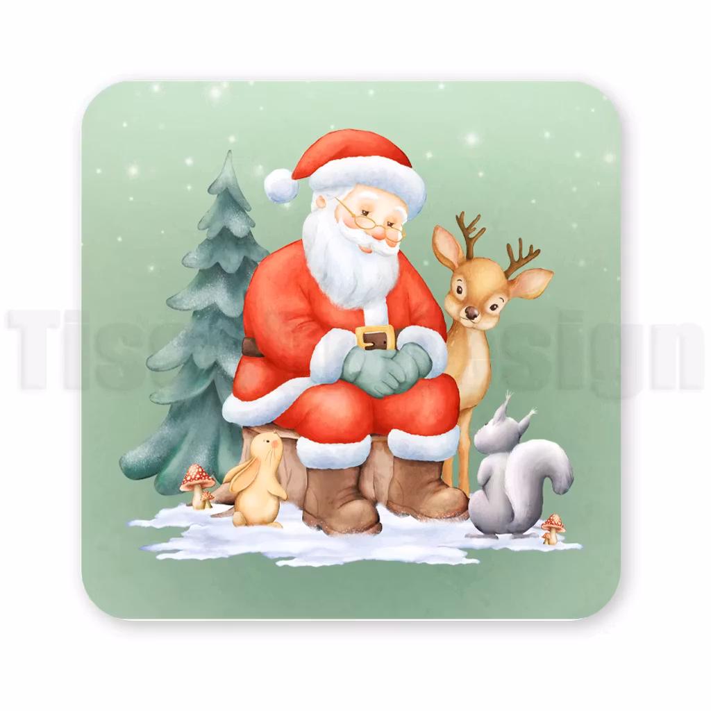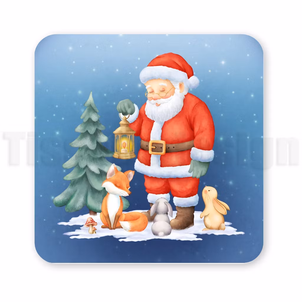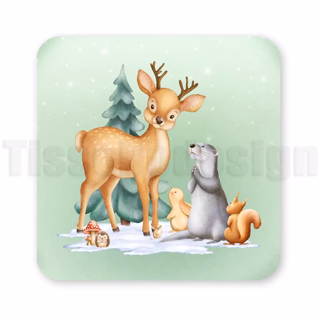 Den här julmagneten visar underbara vintermotiv med tomte, rådjur, ekorrar, kaniner och andra skogsdjur som samlats kring granen. De mjuka färgerna och den stillsamma stämningen gör den perfekt för att skapa en varm och fridfull känsla i hemmet.