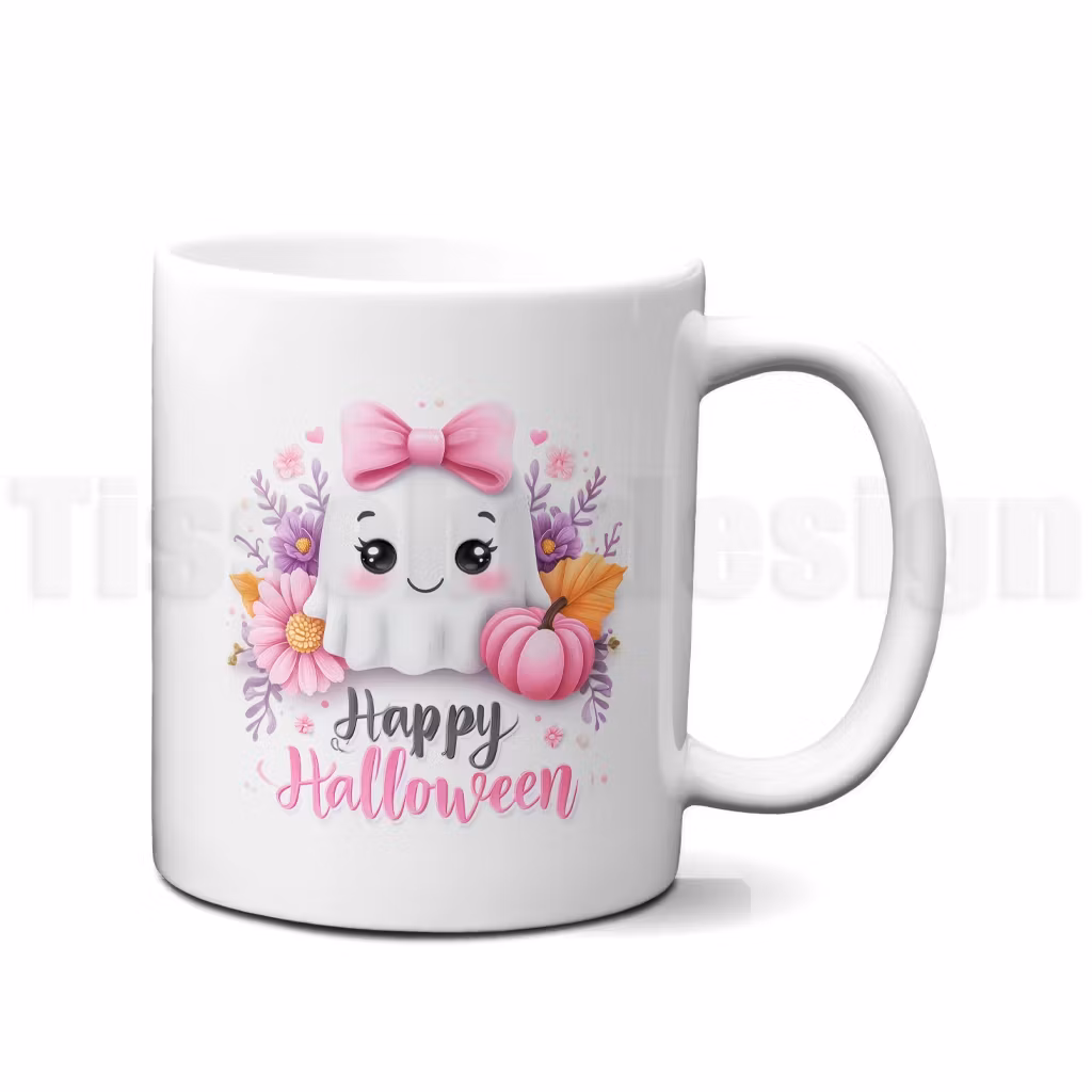 En Halloweenmugg i en mjukare stil! Motivet visar ett gulligt spöke med rosa rosett, omgiven av blommor och pumpor i dova höstfärger. Den är perfekt för dig som vill fira Halloween på ett lekfullt men charmigt sätt – med en kopp te, kaffe eller varm choklad i handen.
