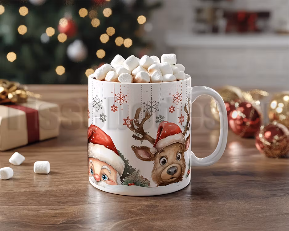 Denna vackra julmugg med motiv av tomten och en ren skapar en härlig och mysig stämning under vintermånaderna. Med sin kapacitet på 330 ml och sitt högkvalitativa tryck på båda sidor är den perfekt för varma drycker som kaffe, te eller choklad. Den tåliga keramiken och de charmiga juliga detaljerna gör denna mugg till en given favorit under julens fikastunder.