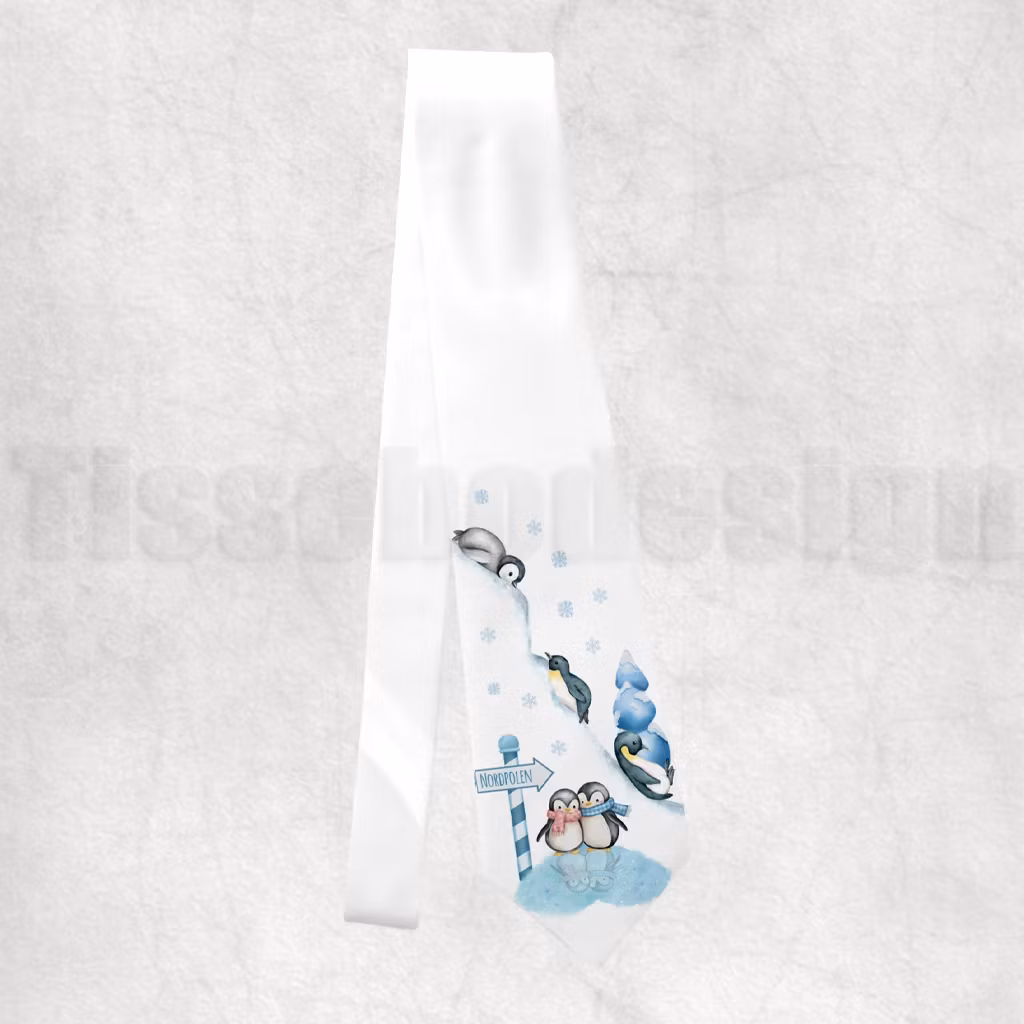 Den här vita slipsen har ett lekfullt och vintrigt motiv med pingviner, snöflingor och skylten ”Nordpolen”. En perfekt accessoar till julfesten, vinterns middagar eller som en rolig gåva till någon som älskar vinter och humor.