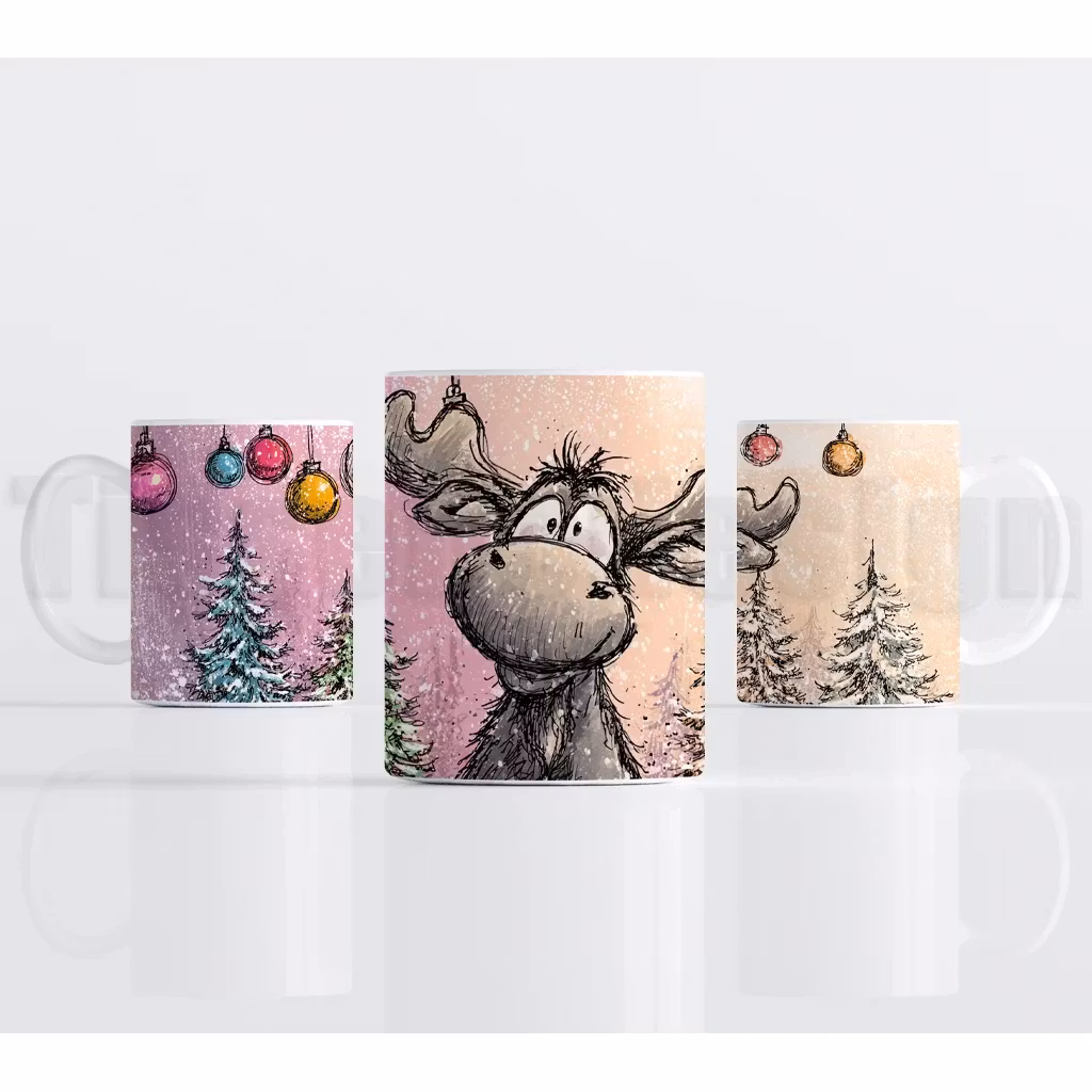 Den här julmuggen har ett handillustrerat motiv med en söt och charmigt förvånad älg, omgiven av snötäckta granar och färgglada julkulor. En perfekt personlig present för både stora och små som önskar en julmugg med tryck som ger både humor och julstämning vid varje fikastund.