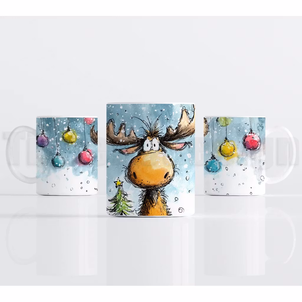 Den här julmuggen visar en humoristisk och söt älg i ett snötäckt vinterlandskap med hängande julkulor i klara färger. Kombinationen av det handritade uttrycket och den lilla granen skapar en varm och lekfull känsla – perfekt som personlig present eller en julmugg med tryck att njuta av hela december.