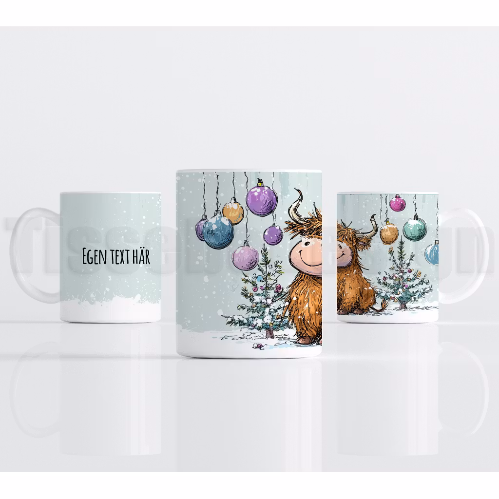 Den här julmuggen har ett charmigt motiv med en söt Highland calf som står vid en liten julgran dekorerad med färgglada kulor. Snöfallet och de mjuka vintertonerna ger en mysig känsla – och tack vare platsen för egen text kan du skapa en personlig present som känns unik och extra omtänksam. En perfekt julmugg med tryck för både barn och vuxna.