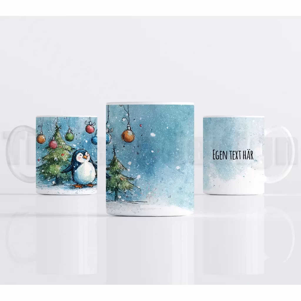Den här julmuggen visar en söt pingvin som står bredvid en dekorerad julgran med färgglada kulor och snöfall i mjuka akvarelltoner. Tack vare möjligheten att lägga till egen text blir den en extra fin personlig present och en julmugg med tryck som känns varm och unik genom hela december.