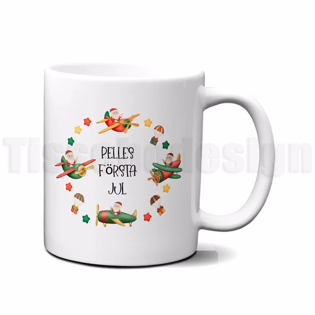 Den här muggen har ett lekfullt motiv med tomtar som flyger flygplan i en fin krans runt texten – och du kan lägga till eget namn eller valfri text, vilket gör den till en perfekt personlig present med tryck för både barn och vuxna. En unik och glad juldesign som sprider värme vid varje kopp kaffe, te eller choklad.