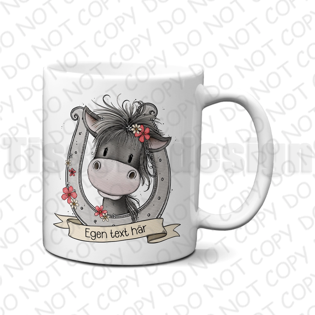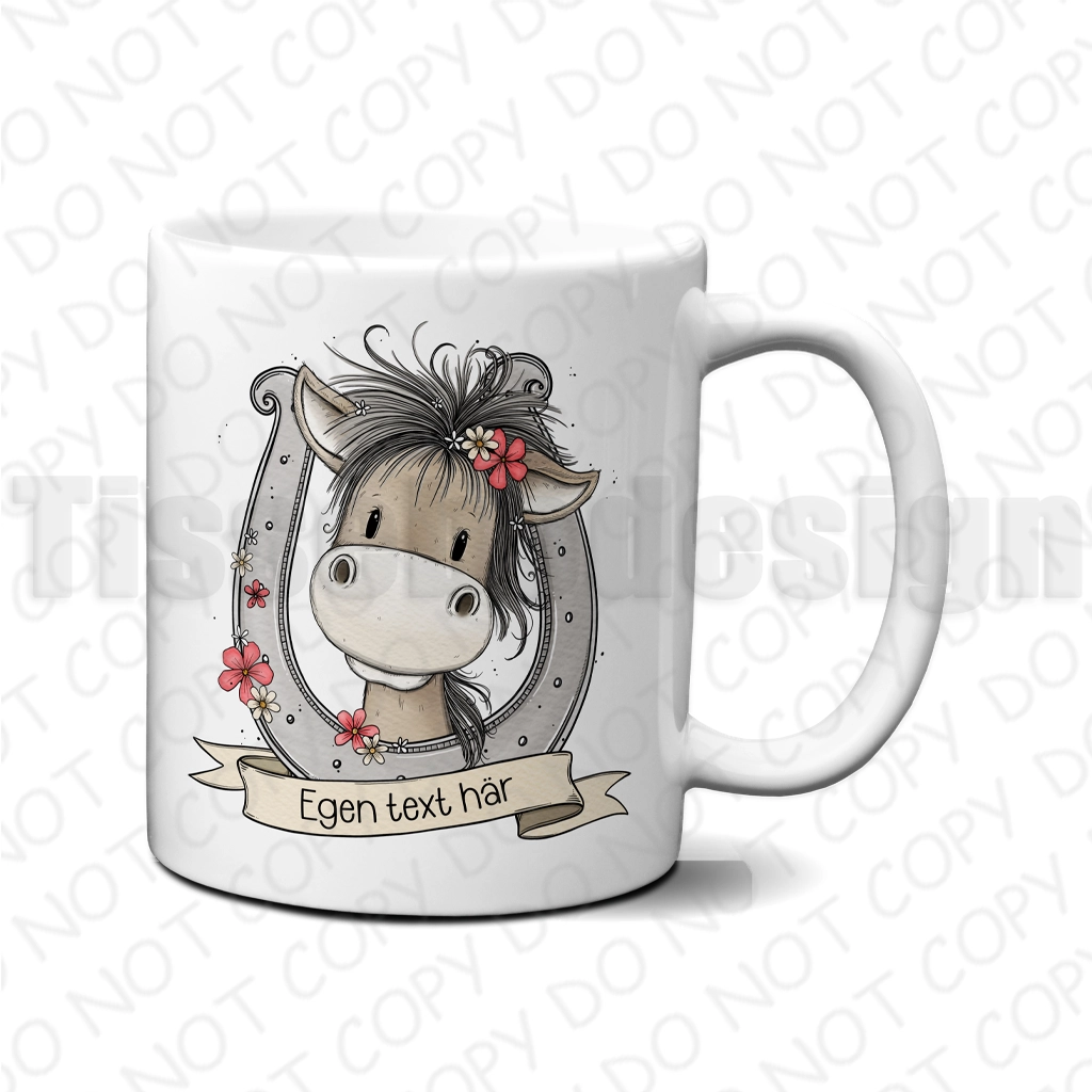 Den här muggen har ett gulligt hästmotiv med blommor och hästsko där du själv kan lägga till egen text. Perfekt som personlig present till någon som älskar hästar eller vill ha något unikt i vardagen.