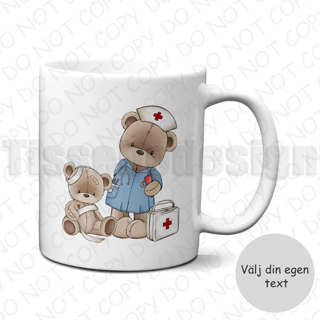 Den här muggen har ett gulligt motiv med en sjuksköterskenalle tillsammans med en liten patientnalle, vilket ger ett varmt och lekfullt uttryck. En mugg med tryck som passar perfekt för dig inom vården eller som söker en personlig present med omtanke och charm.
